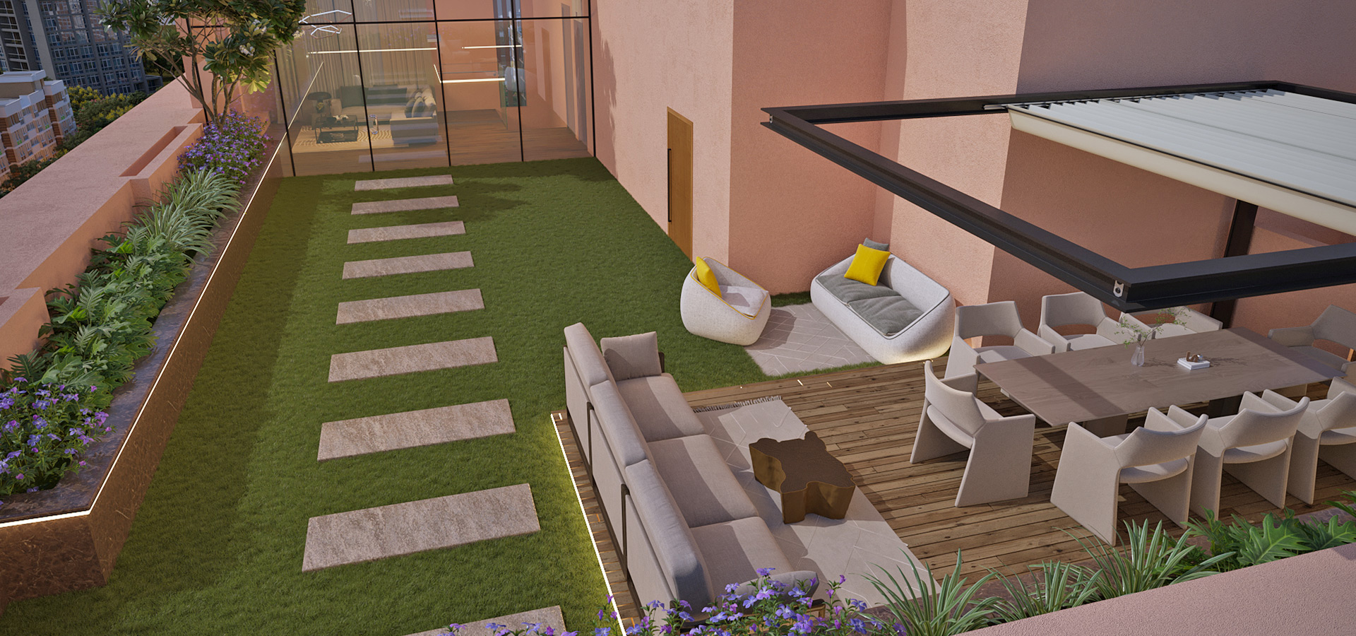 A private duplex with a terrace that extends beyond the home